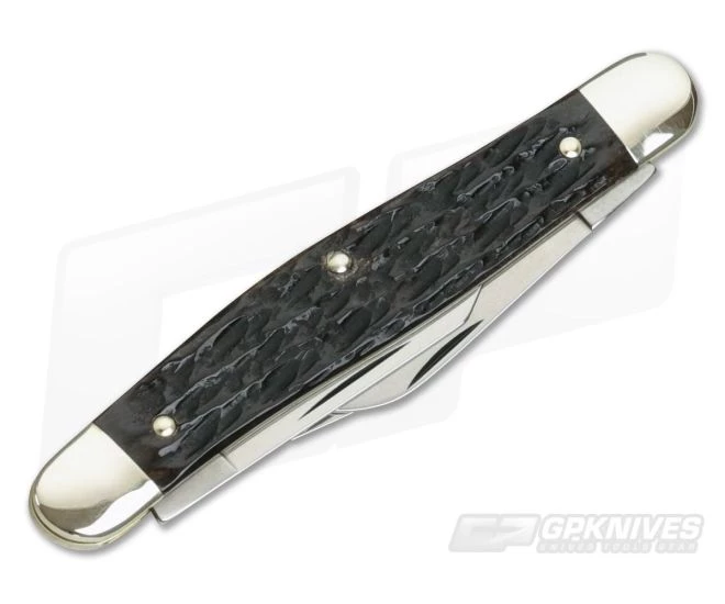 Boker Solingen Appaloosa Series Stockman dressed in traditional jigged bone. Three C-75 carbon steel blades. Nickel silver bolsters, Tree Brand logo shield and brass liners.