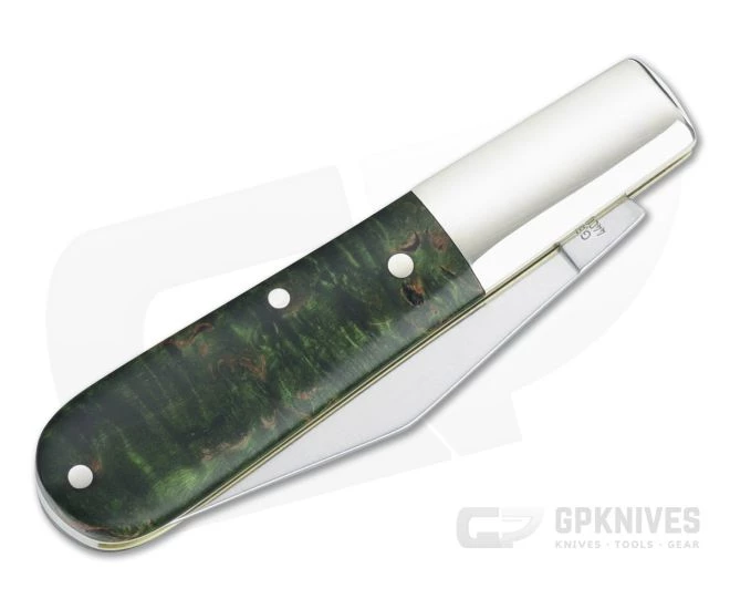 Handle: Mounted to brass liners with stainless steel pins you’ll find the Barlow pattern delivered in bright nickel silver bolsters, sleek and smooth, offset by handsome stabilized green curly birch scales for stunning visual appeal. The front scale is embellished with the Boker Tree Brand shield while a stainless steel back spring delivers smooth yet snappy operation.