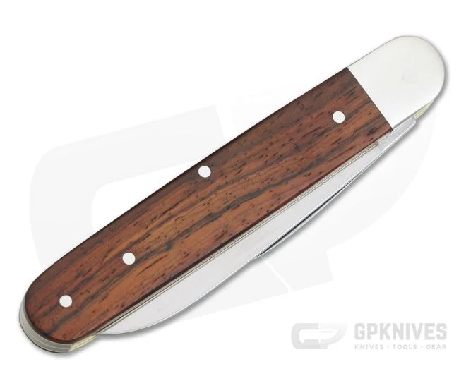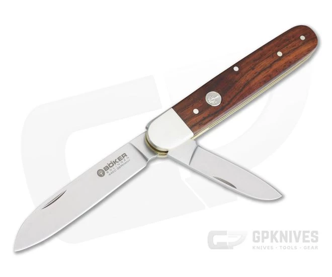 Handle:Â Brushed nickel silver bolsters and Cocobolo wood scales are mounted to brass liners with stainless steel pins offering clean lines and a beautiful, timeless handle. This is a large and comfortable handle built for serious use while retaining a beautiful aesthetic. The front scale is embellished with the Boker Tree Brand Shield. Stainless steel back springs delivers smooth yet snappy operation on both of the blades.