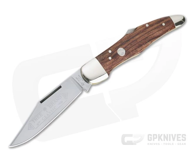 Blade:Â The Folding Hunter sports a single, large clip point blade executed in polished carbon steel with a long pull smooth back lock operation. The full flat grind makes this a very functional and utilitarian blade for users while collectors will be pleased with the visual appeal of the classic Tree Brand logo etch contrasted with the bright, polish finish.