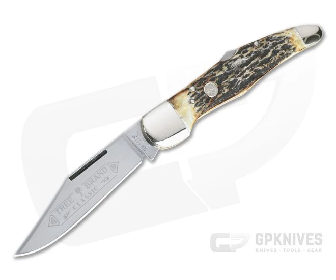 Blade:Â The Folding Hunter sports a single, large clip point blade executed in polished carbon steel with a long pull and smooth back lock operation. The full flat grind makes this a very functional and utilitarian blade for users while collectors will be pleased with the visual appeal of the classic Tree Brand logo etch contrasted with the bright, polish finish.