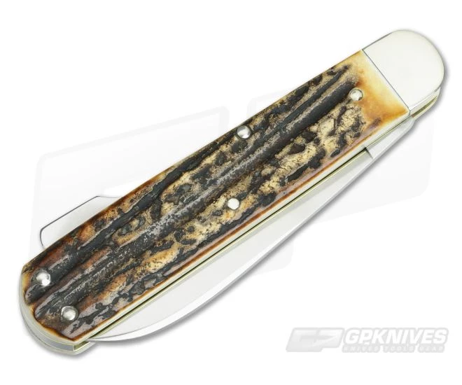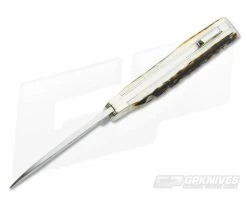 The Handle:Â Nickel silver bolsters top the rugged Stag handle scales which are mounted to brass liners with stainless steel pins for a rugged and comfortable handle, similar to a Barlow. This is a comfortable handle built for serious use while retaining a beautiful aesthetic. The front scale is embellished with the Boker Tree Brand Shield. A stainless steel back spring with a raised tab provides secure and simple lock back operation.