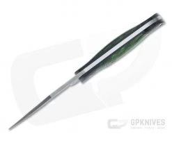 Damasteel:Â A high hardness, high corrosion resistant steel that combines two martensitic stainless steels – RWL34 and PMC27 – in unique patterns that, when etched, create the designs seen on the blade. Damasteel delivers a blade that is very eye-catching and has performance in the realm of RWL34, similar to CPM154.