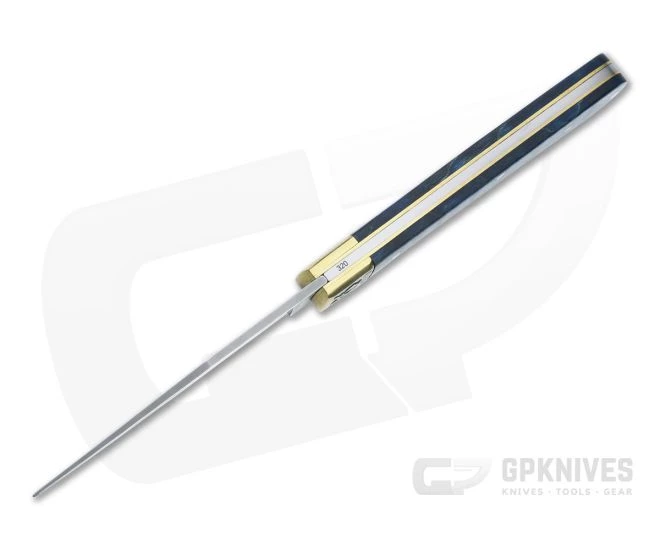 Handle: Smooth blue stabilized curly maple scales are flush fit to decorative brass bolsters featuring the city of Solingen’s coat of arms: two crossed swords of the “City of blades” and an anchor, the symbol of St. Clement, patron saint of the city since the 10th century. The blue maple offers a warm feel and striking look with a unique striped transverse pattern pairing with brass liners and bolsters to form the colors of the city of Solingen. A stainless steel back spring delivers a strong slip joint operation.
