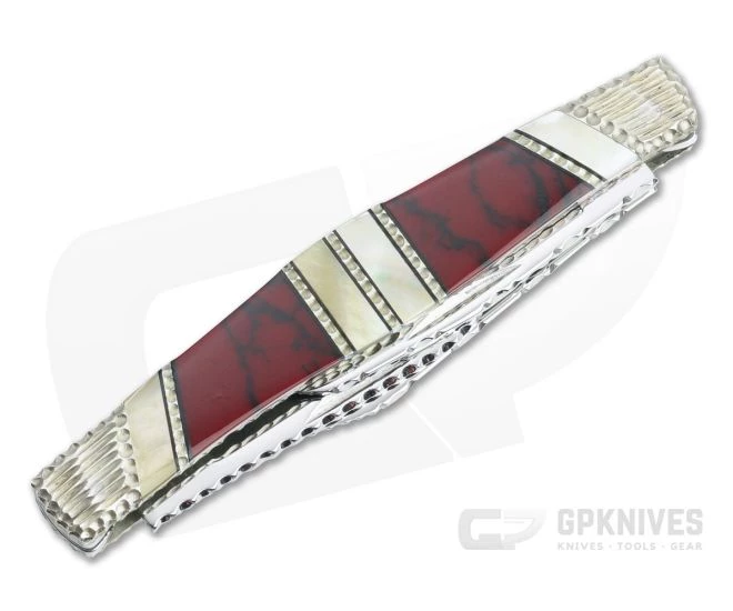 Handle:Â A stunning display piece, the knife features engraved nickel silver bolsters and spacers framing the beautiful gold lip pearl and bloody jasper covers. Custom file work on the dual back spacers complements the worked bolsters, liners and spacers for a cohesive look. Steel back springs offer smooth and reliable slip joint operation for the blades.