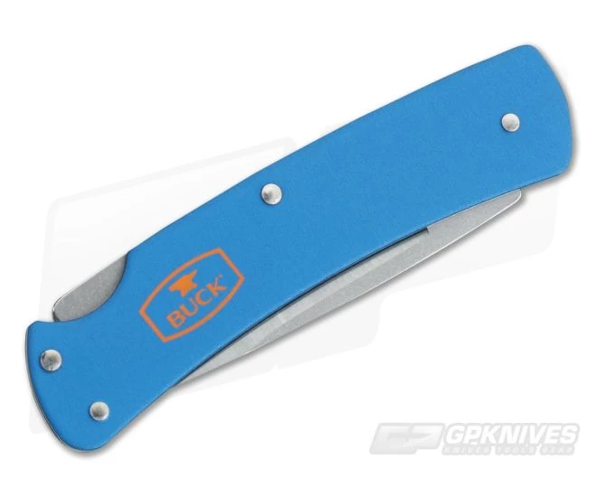 The Handle:Â Thin aluminum handle scales house the blade and back lock mechanism. This Alumni has anodized blue scales with a contrasting Buck logo. The lock back mechanism is simple and reliable and will provide years of solid use. For carry simply slip the Alumni into a fifth pocket, jacket pocket or pouch sheath and you’re ready to go.