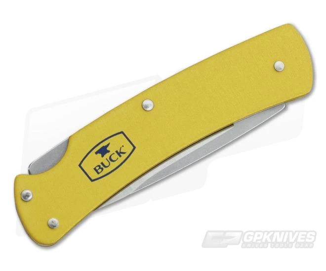 The Handle:Â Thin aluminum handle scales house the blade and back lock mechanism. This Alumni has anodized gold scales with a contrasting Buck logo. The lock back mechanism is simple and reliable and will provide years of solid use. For carry simply slip the Alumni into a fifth pocket, jacket pocket or pouch sheath and you’re ready to go.