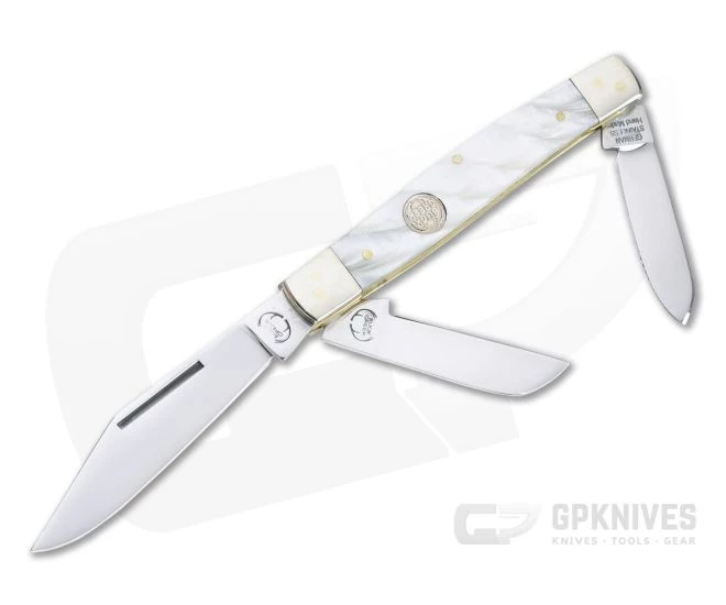 The Buck Creek Big Diamond Back is a classic pattern based on the Stockman, believed to be a scaled down version of the Cattleman pattern. The Big Diamond Back has a sweeping handle and three blades: clip, spey, and sheepsfoot blades. This version comes with Cracked Ice celluloid covers and German stainless steel blades.