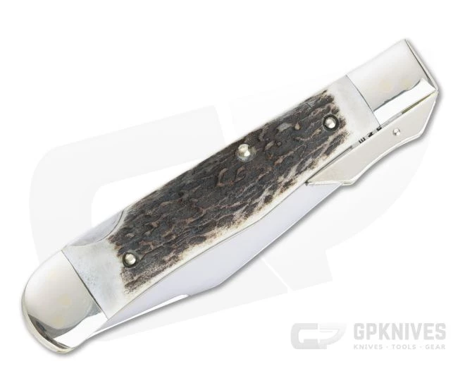 Handle:Ā Nickel Silver bolsters frame the rugged, natural deer stagĀ covers fitted with brass pins to brass liners in the traditional style.Ā The front cover sportsĀ a logo shield while theĀ mid-back lock construction offers simple and smooth locking operation of the blade for safe use.