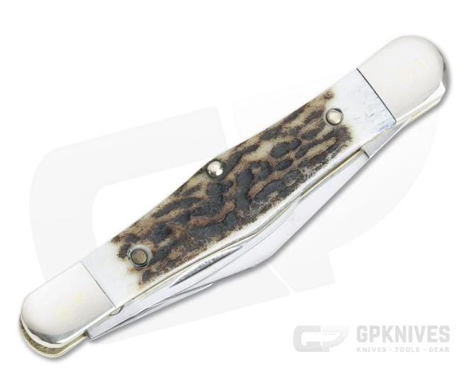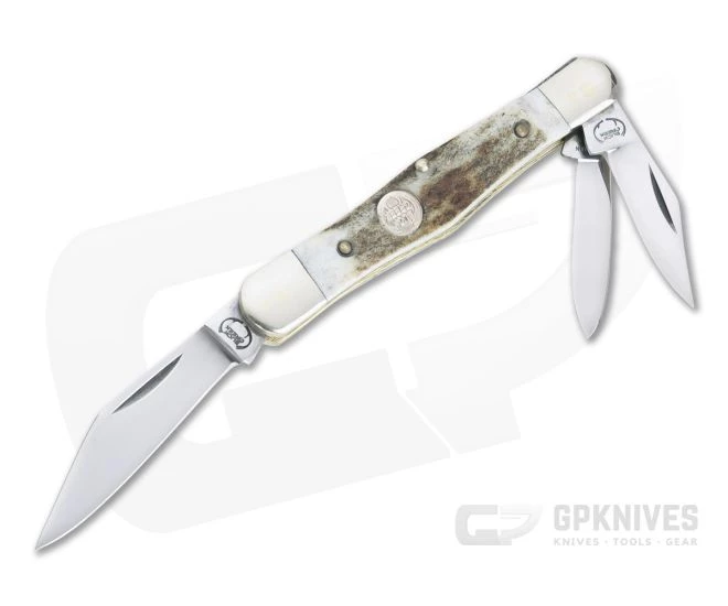 Defined by its split-back spring construction that supports a large single blade on one end and two smaller blades on the other, the Whittler is ideal for carvers and woodworkers as the name implies. Essentially a three-bladed pen knife, the Whittler pattern is equipped with a clip master blade on one end and two small blades, usually a short clip and pen, on the other end. This version has polished German stainless steel blades and deer stag covers.