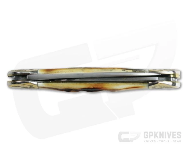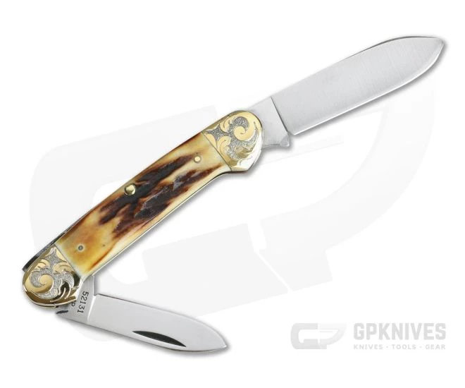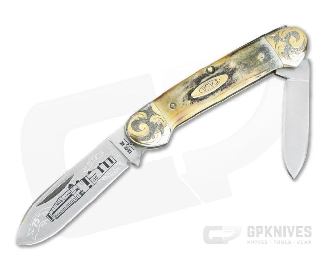 Case 1980 75th Anniversary Canoe. Features a spear point master blade with etched image of the Bradford factory and 75th anniversary logos. Engraved gold plated bolsters and shield. This piece is from a broken set serial #3822. The back of the secondary spear blade is stamped with the pattern number 52131. Pinned stag handles are chip and crack free. With the exception of a few minuscule scuffs on back of master this piece is in mint condition. A nice addition to any collection.