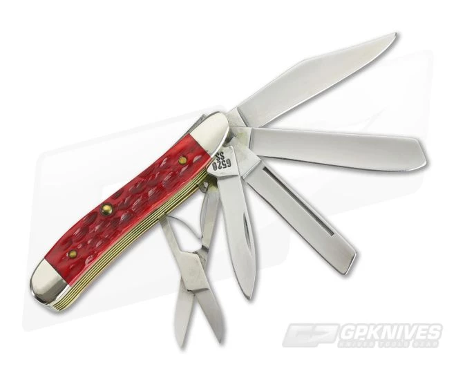 This Case 1996 5 blade red bone peanut also known as Big Nut was produced as a special factory order limited edition. Features 5 mirror polished blade variations: scissors, clip, spey, coping with long pull, and pen blade. Master clip stamped with Case long C and 4 dots. Back of pen bears the pattern number 6520 SS. All blades have half stops with exception of scissors. No rubs or wobble. Nice cherry red jigged bone handles are chip and crack free with inlaid nickel silver Case shield. Peanuts in general are very desirable and valued by collectors.