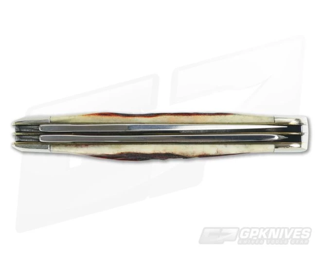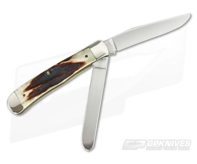 This Case Red Stag Trapper was produced by Case in 1996. The front of the master clip blade is stamped Case with long C and four dots. The front of spey bears the pattern number R5254 SS. Both mirror polished blades have good snap and no wobble. Nice matching deep red stag handles are chip and crack free accented with a nickel silver shield. Red stag is normally valued slightly higher than normal stag and is usually produced in limited production runs.. The trapper is the most popular pattern among the Case family, valued and highly collectible. A nice addition to any collection.