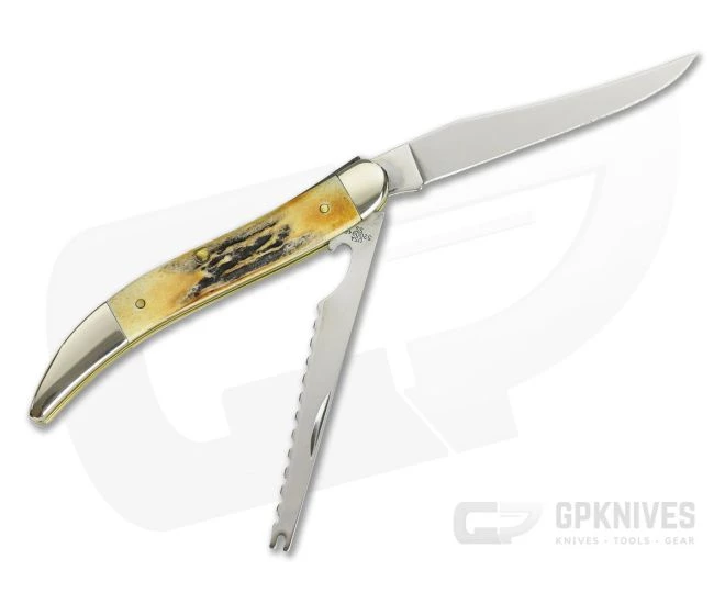 This Case Stag fish knife is somewhat of a rare find. The front of the master clip blade is stamped Case with long C and seven characters. Secondary fish scaler features a hook degorger and bottle opener and bears the pattern number 520094F SS. A hook sharpener is inlaid in the chip and crack free stag handles. Believe this was part of the stag series from 2014 and is the only stag fish knife ever produced by Case that I am aware of. Includes a nostalgic “ORVIS” gift tin and paper work. A great looking piece and a nice addition to any collection.
