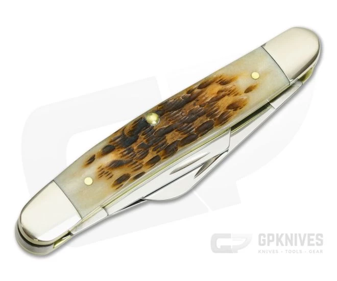 The Stockman is believed to be a scaled down version of the Cattleman pattern and shares similarities in the design. Also known as a ‘Jumbo’ or ‘Big’ Stockman, the Large Stockman is the largest of this pattern and comes with a main clip point blade and two auxiliary blades. This version comes with beautiful, rugged Peach Seed Jigged Amber Bone covers and polished Tru-Sharp blades.