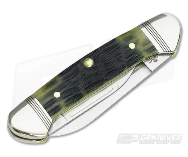 The Handle: Crandall Olive Green Jigged Bone covers offer their natural texture and eye-catching color pinned to brass liners in a traditional construction. Nickel Silver bolsters sport embellished grooves and the front cover has the classic Case Oval Shield.