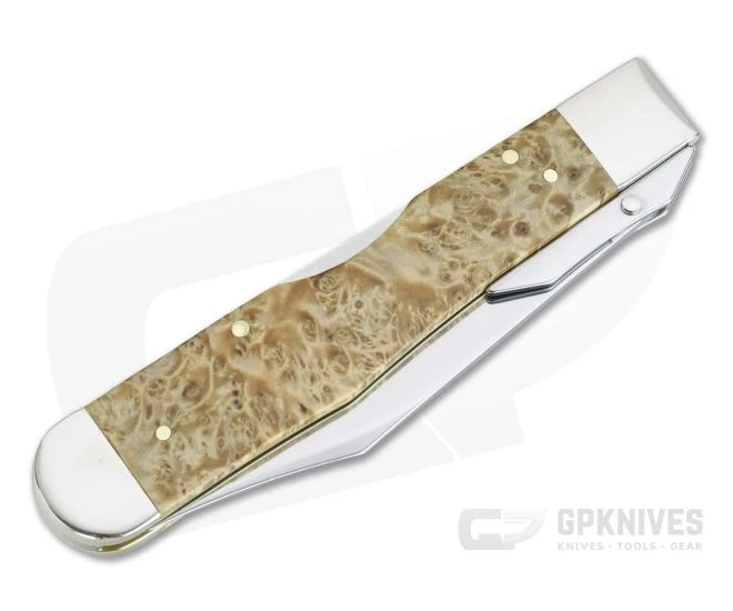Handle:Â Nickel Silver bolsters frame the handsome, Smooth Natural Box Elder Burl Wood covers fitted with brass pins to brass liners. The front cover sports an engraved “Case XX” logo en lieu of a shield. A mid-back lock construction offers simple and smooth locking operation of the blade with one-hand operation.
