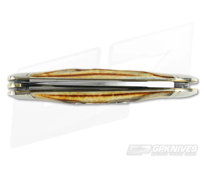 1993 Case Classic Seahorse Whittler with mirror polished carbon steel blades. Features a wharncliffe master blade stamped CASE with long C Tested XX USA 1993. Back of master also stamped TESTED XX with pattern number 5355. Also two secondary coping blades, one bears the Case XX TESTED circle shield while other secondary coping stamped CASE with long C TESTED XX USA. A few tiny minuscule rubs on master and secondary. All sitting on a tapered back spring with all blades having good snap. One coping blade has very slight wobble. Nice thick Sanbar stag accented with a nickel silver pinned bowtie shield which are chip and crack free. Pinched grooved slanted bolsters enhance the appearance of this great looking piece. Made in the old school tradition by Blue Grass Cutlery under license from W.R.Case ans Sons.