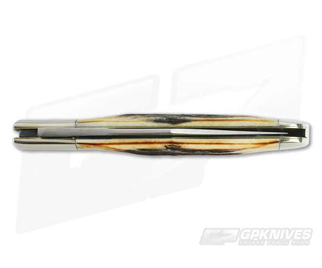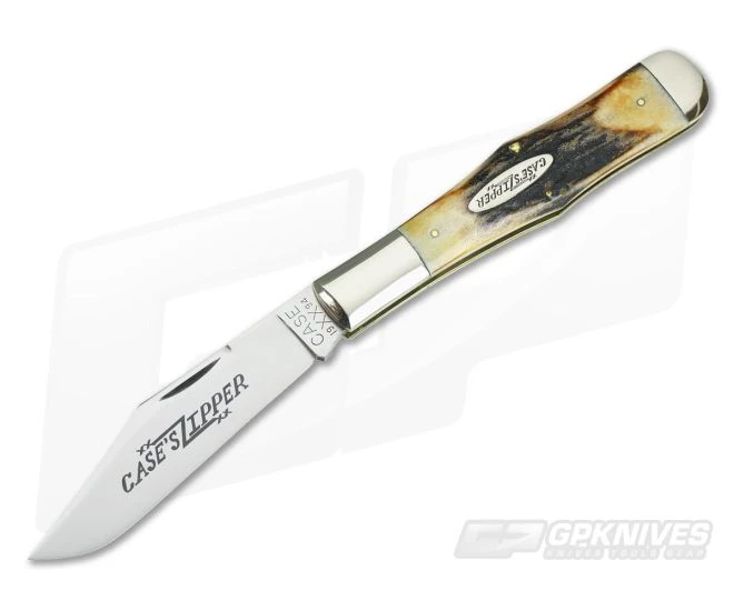 This Case Classic knife was produced in 1994 and features a large clip point blade inked ‘CASE’S ZIPPER’. Front of master stamped CASE XX 1994. Back of master bears the pattern number 51050 TESTED XX. Nice fat sambar stag handle with a lot of character accented with a nickel silver Case ZIPPER shield. The blade on this coke bottle pattern also has a half stop. Produced by Blue Grass Cutlery in very limited production.