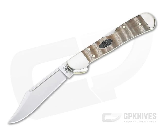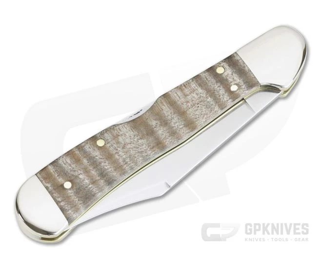 Handle:Â Polished Nickel Silver bolsters frame eye-catching Smooth Natural Curly Maple Burl Wood covers that offer a warm in-hand feel and timeless, rugged style. The covers are fitted with brass pins to brass liners and the front cover sports a “Case XX USA” embossed shield. A sturdy back spring offers simple, smooth mid-back lock operation for secure use.