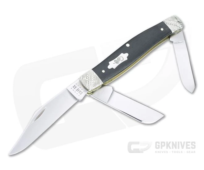 Handle: Smooth, black Ebony wood covers are fit between two sets of nickel silver bolsters that have been tool worked for a textured feel and custom look. Ebony has a warm, organic feel in hand with solid durability and weather resistance. The covers are attached with brass pins to brass liners in the traditional style. The front cover sports a Case Bow Tie shield while dual stainless steel back springs deliver smooth, simple and secure slip-joint operation.