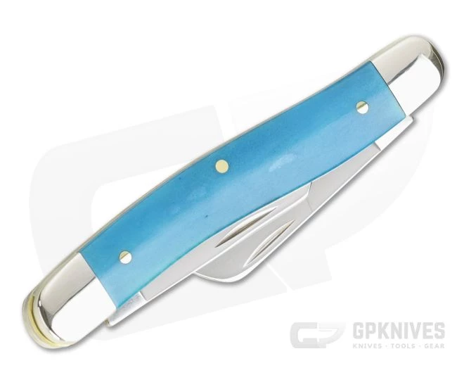 Handle: The stunning Caribbean Blue smooth bone covers are fit between two sets of polished nickel silver bolsters and have a great in-hand feel. The covers are attached with brass pins to brass liners in the traditional style. The front cover sports a Case Badge shield while dual stainless steel back springs deliver smooth, simple and secure slip-joint operation.
