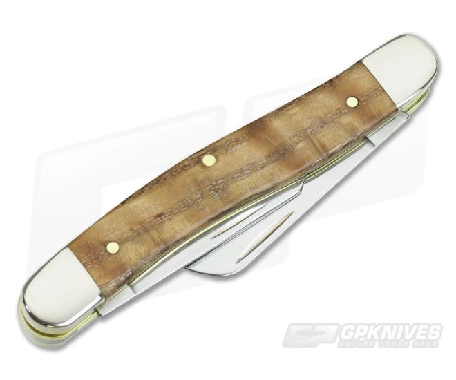 Handle:Â Polished Nickel Silver bolsters frame warm, classic Smooth Natural Curly Oak covers that offer a comfortable and generous grip. The covers are fitted with brass pins to brass liners with the Case Oval Scrip shield. The sturdy back springs offer simple, smooth slip joint operation for use.