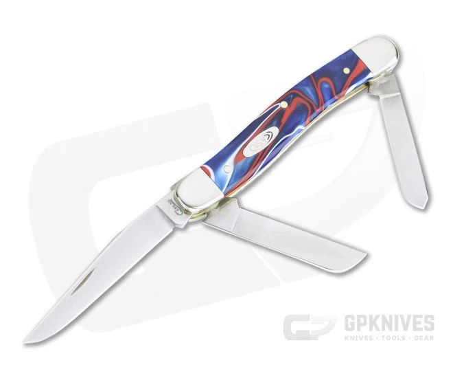 Handle:Â Polished Nickel Silver bolsters frame the visually appealing, Smooth Patriotic Kirinite acrylic covers that offer a comfortable and generous grip. Kitinite offers full, through-color with the same durability as Corian acrylic polymer used in countertops! The covers are fitted with brass pins to brass liners with the Case Oval Scrip shield and sturdy back springs for simple, smooth slip joint operation.