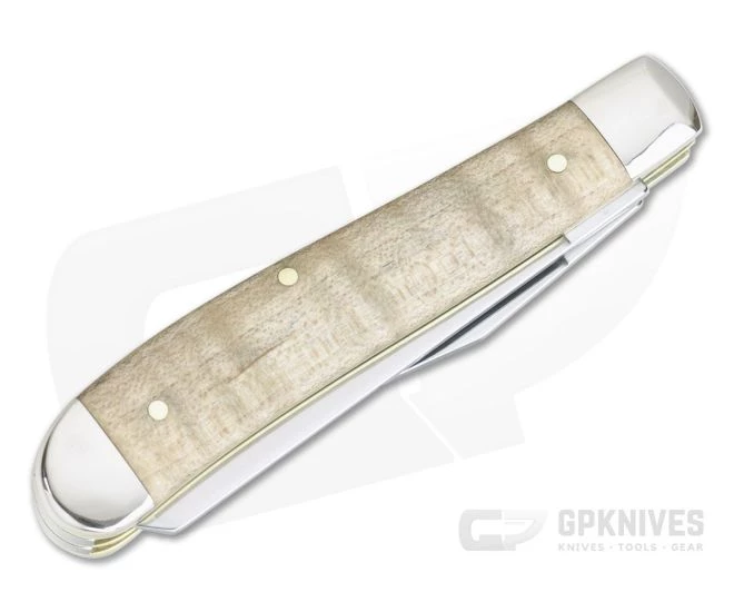 Handle:Â Smooth Natural Curly Maple burl wood covers are rugged and timeless with a warm, natural feel and visually striking, rippled look. Framed by nickel silvers bolsters the scales are attached to brass liners with brass pins in the traditional style and feature a “Case XX USA” embossed shield on the front.