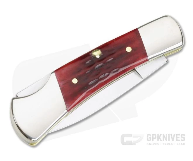 Case Small Lockback with old red bone handles and Tru-Sharp stainless steel drop point locking blade. Nail nick for easy opening of blade. Nickel silver bolsters and brass liners.