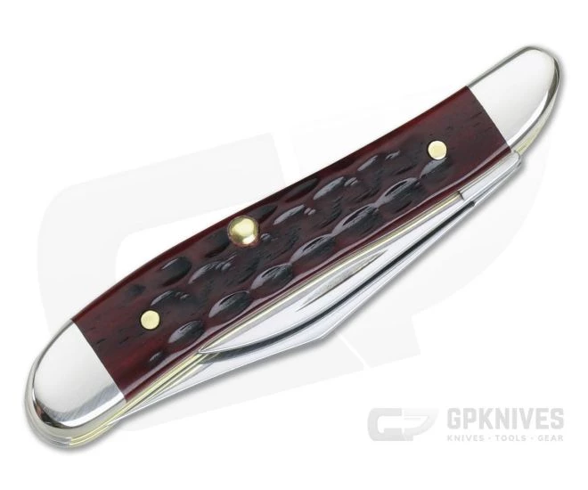 Case Peanut with old red bone handles and Tru-Sharp stainless steel clip and pen blades. Nail nicks for easy opening of blades. Nickel silver bolsters and brass liners.
