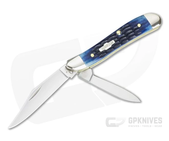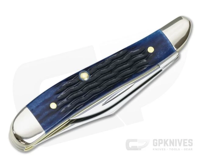Case Peanut knife with Blue Jigged Bone handles makes a great companion! This peanut features two Tru-Sharp stainless steel blades, a clip and pen with a mirror polish finish and nail-nick openers. The deep-sea True blue handles have been attached to brass liners with brass pins and also boasts a Chevron-Style Case USA Shield on the front side. Brand new directly from W.R. Case & Sons.