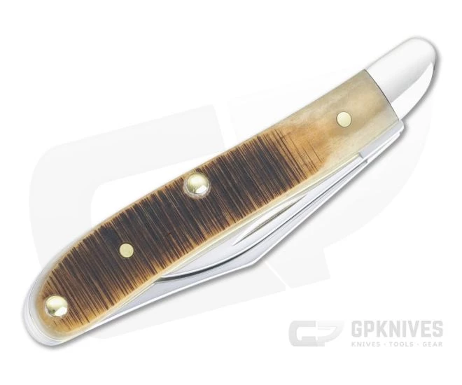 The small, serpentine-shaped jack knife from Case knives known as the Peanut comes equipped with dual blades mounted at the same end of the elegantly curved handle. The Peanut makes a great choice for dress carry and easily finds a home in a fifth pocket or coin pocket. The “barehead” moniker reference the traditional American feature of no bolster at the cap end. This version comes with Tru-Sharp stainless-steel blades and Sawcut Jig Amber Bone covers.