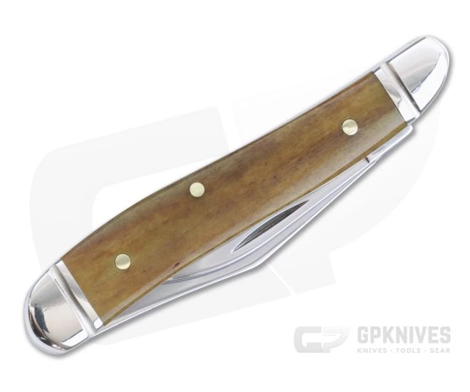 The small, serpentine-shaped jack knife from Case knives known as the Peanut comes equipped with dual blades mounted at the same end of the elegantly curved handle and beautiful Smooth Antique Bone covers. The Peanut makes a great choice for dress carry and easily finds a home in a fifth pocket or coin pocket.