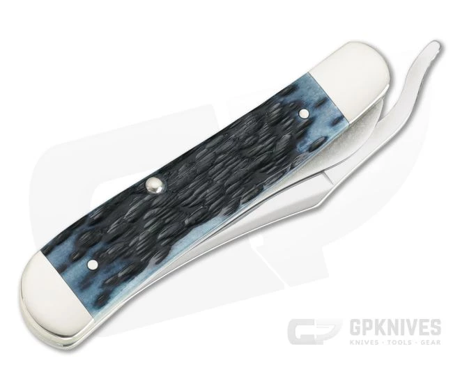 Handle: The rugged Blue Denim bone covers are fit between two sets of polished nickel silver bolsters and have a great in-hand feel with Peach Seed Jigged texture for traction. The covers are attached with stainless pins to stainless liners in the traditional style. The front cover sports a Case Bombshell Script shield while a stainless steel liner lock provides reliable, smooth, simple and secure locking operation.