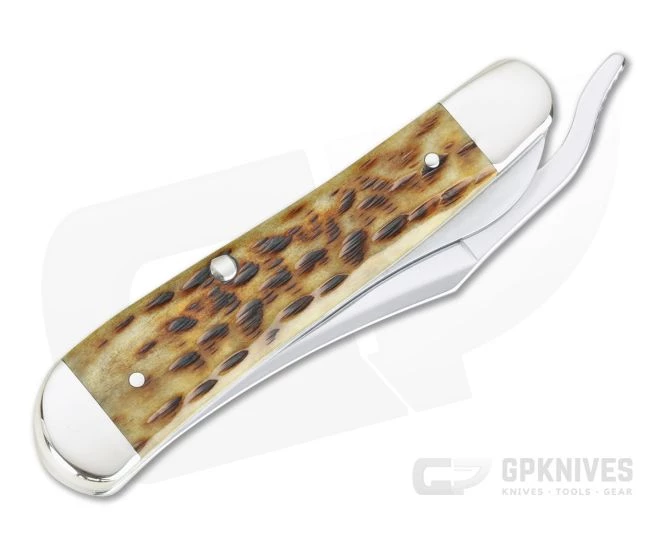 Handle: The rugged Antique Bone covers are fit between two sets of polished nickel silver bolsters and have a great in-hand feel with Peach Seed Jigged texture and a Pocket Worn finish. The covers are attached with stainless pins to stainless liners in the traditional style. The front cover sports a Case Propeller shield while a stainless steel liner lock provides reliable, smooth, simple and secure locking operation.