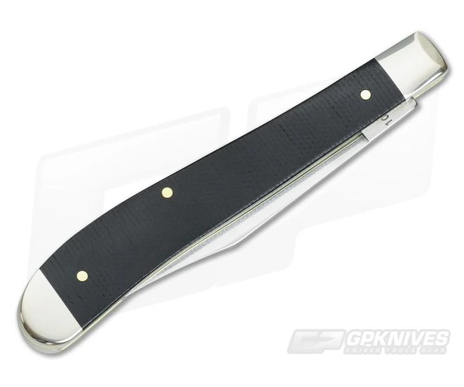 The Handle:Â Black Canvas Laminate covers are attached to brass liners with nickel silver pins in the traditional style. The laminate material is highly durable and offers plenty of traction for every day use. The front cover sports an embossed Case Shield. Half-stop equipped slip-joint operation provides simple and secure operation of the knife while in use.