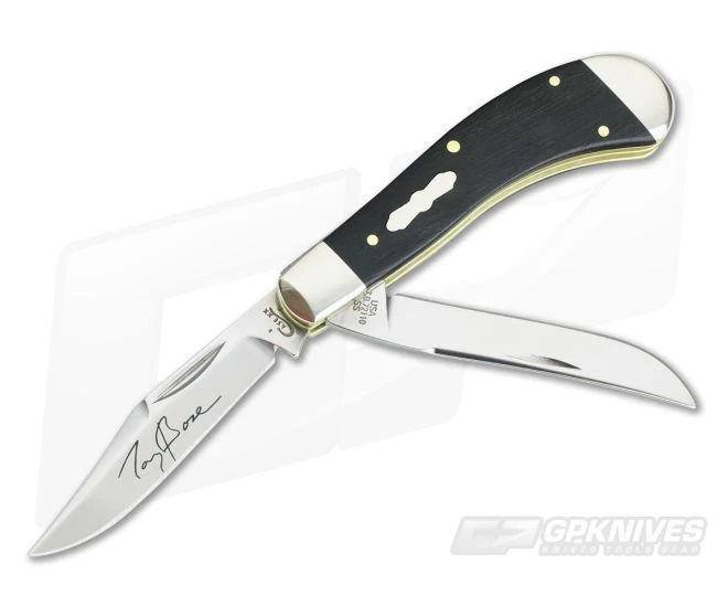 The Blade:Â The Small Saddlehorn comes equipped with dual Clip and Skinner blades at the same end of the handle. The blades are made from polished Tru-Sharp stainless steel and operate with a solid half-stop and excellent “walk and talk”. As a a SHOT Show exclusive, this limited production piece is marked with Tony Bose’s signature on the primary blade.