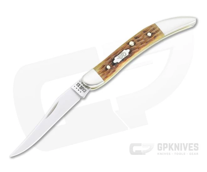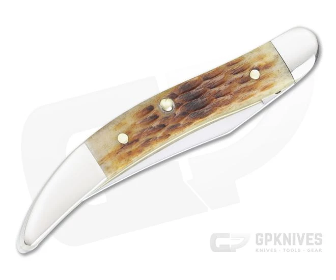 Handle:Â The rugged Antique Bone covers are fit between two sets of polished nickel silver bolster and have a great in-hand feel with Rogers Corn Cob Jig texture for traction. The covers are attached with brass pins to brass liners in the traditional style with a solid back spring for secure slip-joint operation. The front cover sports an embossed Case Bow Tie shield.