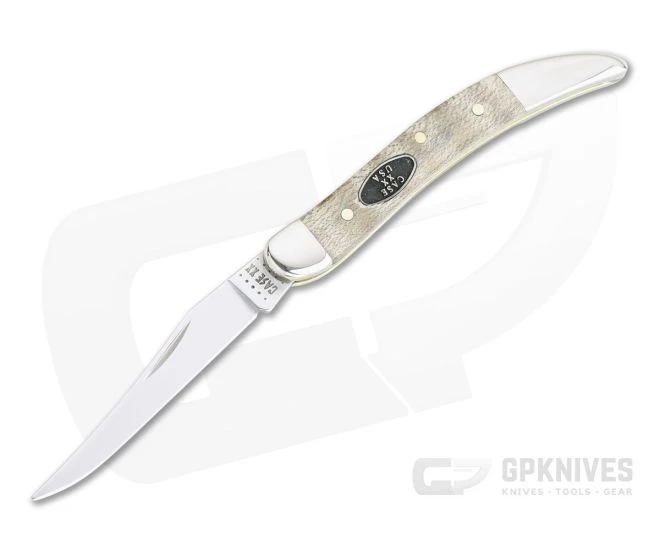 Handle:Â Smooth Natural Curly Maple covers are rugged and timeless with a warm, natural feel and visually striking, rippled look. The covers are fit between two sets of polished nickel silver bolster and have a great in-hand feel. The covers are attached with brass pins to brass liners in the traditional style while the front cover sports a “Case XX USA” embossed shield. This model has a solid back spring with smooth slip joint operation.