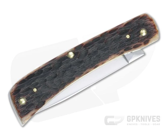 A smaller version of the classic working knife, the Sod Buster Jr. is easy to carry and ready to get the job done. A simple, sturdy single blade slip joint, the Jr. has a practical skinner blade and generous handle. This version comes with a Tru-Sharp stainless-steel blade and handsome Peach Seed jigged brown bone covers.