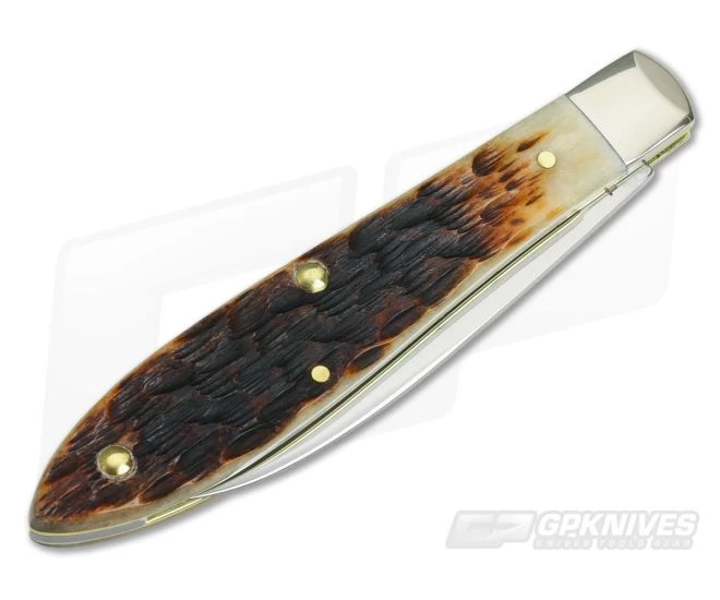 The Case Tear Drop Jack Amber Bone knife is a single spear blade in Tru-Sharp stainless steel. Designed in collaboration with Tony Bose, this is a more modern take on the classic pattern. The blade has been mirror polished and has a nail nick for easy opening. Handsome jigged bone handles have been solidly pinned to brass liners. Single nickel silver bolster and traditional nickel silver oval Case shield gives a classy look. Brand new direct from Case Knives.