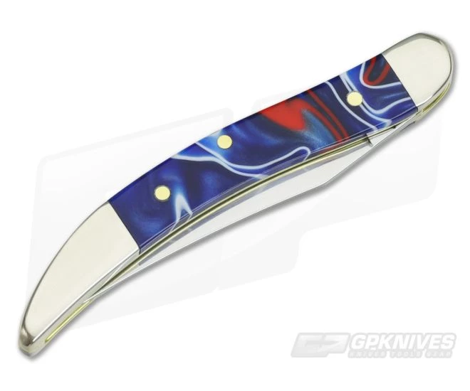 Case Tiny Toothpick with Patriotic Kiriniteâ„¢ handle scales has a length of only 3″ and weighs less than an ounce.The scales are polished and pinned to the brass liners with a Case oval shield. This new handle material holds the color all the way through and is just as tough and durable as Corianâ„¢. Features one long clip point blade with a mirror polish and nail-nick opener. The two solid nickel silver bolsters have also been polished to a high luster. Brand new from W. R. Case and Sons.