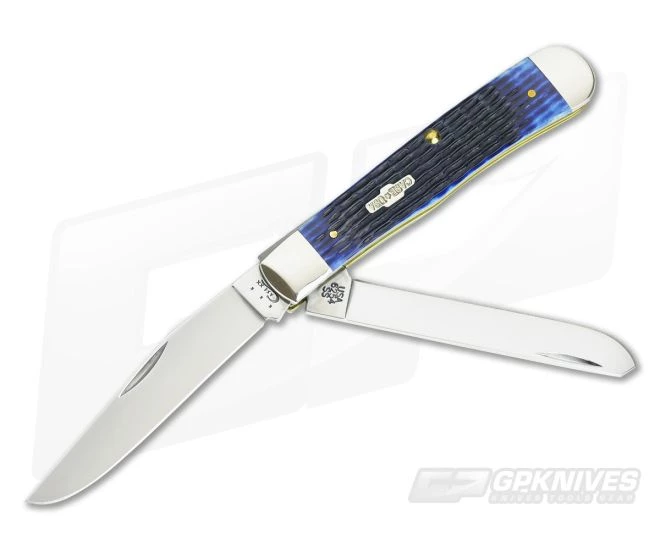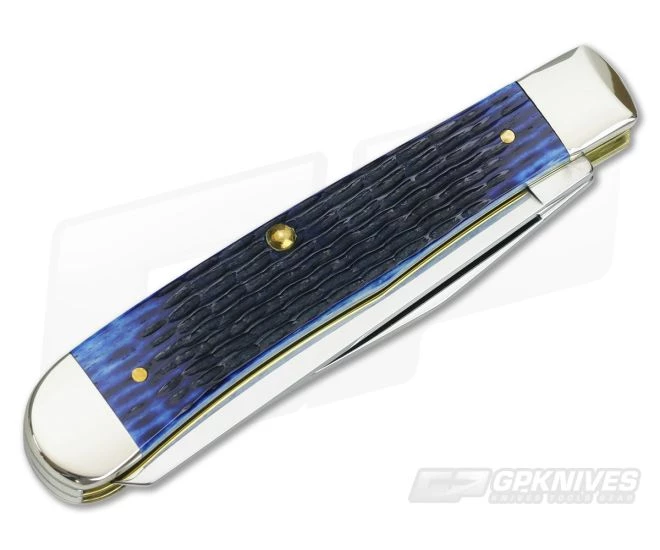 Case Trapper knife with Blue Jigged Bone handles makes a great companion! This trapper features two Tru-Sharp stainless steel blades, a clip and spey, both with a mirror polish finish and nail-nick openers. The deep-sea true Blue handles have been attached to brass liners with brass pins and also boasts a Chevron-Style Case USA Shield on the front side. Brand new directly from W.R. Case & Sons.