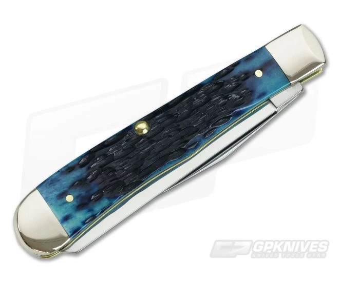 Handle:Â Ocean Blue Jigged Bone covers are attached to brass liners with brass pins in the traditional style. The classic Peach Seed jigged bone adds traction in the hand while the Ocean Blue Bone is appealing to users and collectors alike . The front cover sports an embossed Case Diamond Shield. Smooth, slip-joint operation provides simple and secure operation of the knife while in use.