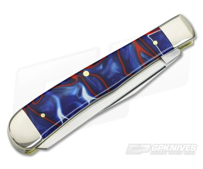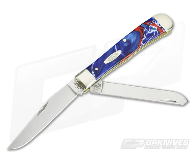 Case Trapper with Patriotic Kiriniteâ„¢ handle scales with a closed length of 4 1/8″. The scales are polished and pinned to the brass liners with a Case oval shield. This new handle material holds the color all the way through and is just as tough and durable as Corianâ„¢. Features two highly polished Tru-Sharp stainless blades, a Clip and Spey. Each blade has a nail nick for easy opening. The two solid nickel silver bolsters have also been polished to a high luster. Brand new from W. R. Case and Sons.