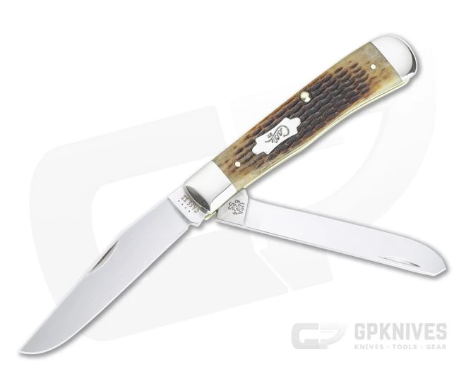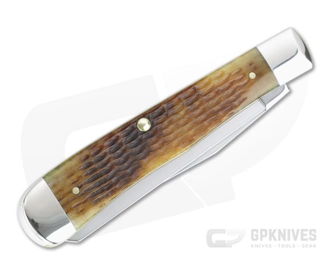 The classic Case Trapper pattern is a large, traditional folder designed for hunters, trappers and other backcountry folk who needed a lightweight yet capable cutting tool. The classic slip joint design offers two large blades at the primary end of the robust and comfortable handle. Rugged, handsome and timeless, this is great for daily use or as an addition to any Case collection. This version comes with polished Tru-Sharp stainless steel blades and rugged Rogers Corn Cob Jig Antique Bone covers.