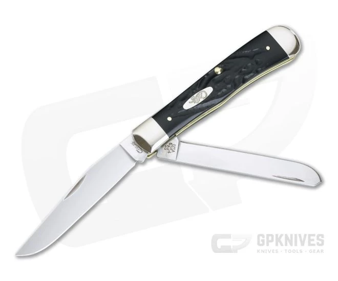 The Case Trapper with rough black synthetic handles is a revival of a WWII era handle material known as “gum fuddy”. This Trapper pattern features black synthetic handles with light jigging giving the knife a classic look and feel. The black synthetic handle is nearly indestructible and has been pinned to the brass liners of the knife with brass pins. You will also find the classic oval Case shield on the front side of the handle. The rough black handle scales are accented with nickel silver bolsters. Housed within the handle are two mirror polished tru-sharp stainless steel blades, a clip point and spey blade.