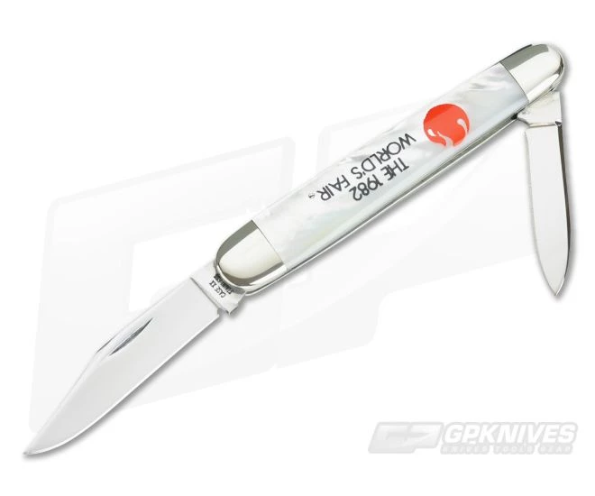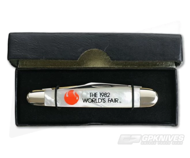 Case XX U.S.A. (1982) Worlds Fair Sleeveboard in near mint condition. Although produced in 1982 master clip stamped Case XX stainless USA with 1 dot. ( which apparently was a blade left over from (1979) production. Featuring mirror polished clip and pen blades. Both blades have good snap. The front of pen blade has a small minuscule rub. Back of master clip also has a small rub and tiny ding where blade hits back spring. Pearl handles feature inked worlds fair logo and are chip and crack free. The back of pen blade bears the pattern number 079. Includes original cardboard gift box which is in excellent condition. This knife has never been carried or sharpened. Listed as near mint due to tiny ding in master blade. More images are available upon request.