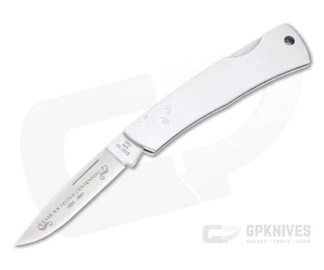 This slim vintage 1989 Case XX Centennial Lockback has brushed stainless steel handles and satin finished stainless steel blade with “Case XX Tested Centennial 1889-1989” etch. Knife only.